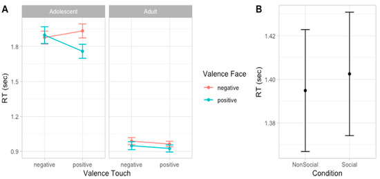 Plots of the effects predicting RTs. Dots represent the mean values and bars represent the standard errors. Left panel (A) shows the interaction effect between Face valence and Touch valence in adolescents and adults; right panel (B) shows the main effect of Social condition. (n participants = 60; n observations = 1832).