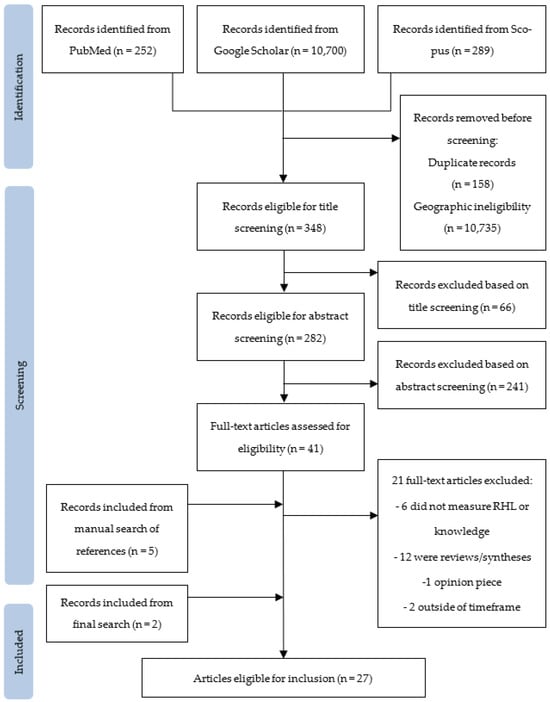 Chicago/Turabian StyleTseng, Kimberly W., Henna Mohabbat, Anne Adachi, Angela Calaguas, Amardeep Kaur, Nabeala Salem, and Zahra Goliaei. 2025. "Reproductive Health Literacy and Knowledge Among Female Refugees: A Scoping Review of Measurement Methodologies and Effect on Health Behavior" International Journal of Environmental Research and Public Health 22, no. 7: 1121. https://doi.org/10.3390/ijerph22071121