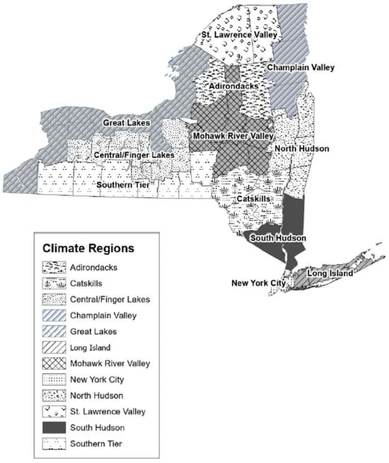 - Lamie, C.; Bader, D.; Graziano, K.; Horton, R.; John, K.; O’Hern, N.; Spungin, S.; Stevens, A. New York State Climate Impacts Assessment Chapter 02: New York State’s Changing Climate. Ann. N. Y. Acad. Sci. 2024, 1542, 91–145. [Google Scholar] [CrossRef]
