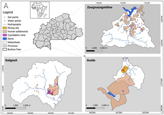 This study was conducted on three artisanal and small-scale mining (ASM) sites in Burkina Faso: Guido, Galgouli, and Zougnazagmiline. These sites are located in the country’s three main climatic zones, enabling a comparative analysis of pollution dynamics across distinct environmental contexts. Zougnazagmiline, situated in the commune of Bouroum (Central–North region), lies within the Sahelian zone, approximately 250 km north of Ouagadougou. Guido is located in the commune of Réo (Central–West region), representative of the Sudanian–Sahelian zone. Lastly, Galgouli is found in the commune of Kampti (Southwest region), within the Sudanian zone, about 450 km southwest of the capital, near the border with Côte d’Ivoire (Figure 1).
