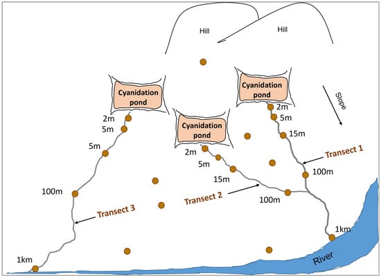 Soil sampling combined random and systematic approaches within the watershed of each site. Transects were established along erosion channels, starting from cyanidation ponds identified as primary contamination sources. Samples were collected at approximately 2 m, 5 m, 15 m, 100 m, and 1 km from these ponds. Additional random samples were taken to better capture spatial heterogeneity. Sampling site selection also considered proximity to hydraulic structures (Figure 2). Using a hand auger, samples were taken from the 0–20 cm surface horizon. Approximately 500 g of soil was collected per point and stored in labeled black plastic bags to prevent cyanide photodegradation []. Samples were preserved in coolers with ice to maintain their physico-chemical integrity prior to laboratory analysis.