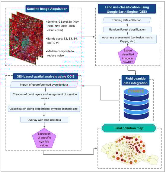 Free cyanide concentration data, stored in a structured Excel file with geolocation, were verified, cleaned, and converted into point layers in QGIS version 3.34 (UTM WGS 84, zone 30 N). Each point was assigned a free cyanide concentration value and symbolized using proportional symbols—spherical markers whose size reflects pollution levels []. These symbols were classified into three pollution categories, with dark red spheres indicating highly polluted zones, orange for moderately polluted zones, and green for low pollution levels. The resulting point layer was overlaid with the land use classification to analyze spatial relationships. Specific free cyanide values were extracted by surface unit types (e.g., settlements, water bodies, agricultural land) using zonal statistics. Contaminated zones were identified based on environmental and health thresholds, supporting targeted risk characterization. This workflow aligns with standard spatial analysis procedures in environmental monitoring [,]. The key steps of the spatial analysis workflow are summarized in Figure 3, illustrating the integration of land use classification and free cyanide concentration mapping.