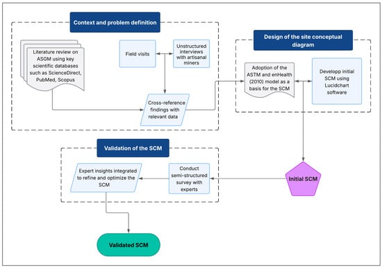 Flowchart illustrating the development, design, and validation process of the site conceptual model (SCM) for assessing cyanide-related exposure risks in ASGM contexts.