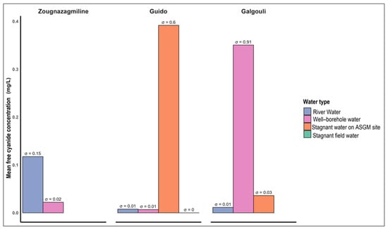 Figure 6 shows free cyanide concentrations across the various water matrices from the artisanal mining sites of Zougnazagmiline, Guido, and Galgouli, highlighting the marked variability by site and water type. Overall, 9.26% of the samples exceed the WHO guideline of 0.07 mg/L []. At Zougnazagmiline, the values ranged from 0.009 to 0.223 mg/L, with river water showing the highest mean (0.117 mg/L), with lower levels in wells and boreholes (0.022 mg/L). At Guido, concentrations varied between 0 and 1.084 mg/L, peaking in stagnant mining water (0.392 mg/L), while well and river waters remained below 0.01 mg/L. No cyanide was detected in stagnant field waters. Galgouli showed the widest range (0.002–2.42 mg/L), with the highest mean in well–borehole water (0.350 mg/L), moderate levels in stagnant mining and field waters (0.036 and 0.124 mg/L), and the lowest in river water (0.011 mg/L).