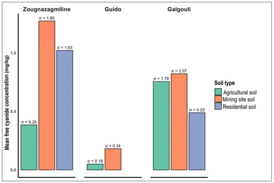 Figure 7 reveals a skewed distribution of free cyanide concentrations in soils from the artisanal gold mining sites in Burkina Faso, with marked variation by soil type and location. Nearly 29.36% of samples exceed the Canadian Council of Ministers of the Environment (CCME) guideline of 0.5 mg/kg for uncontaminated soils [], indicating localized pollution with potential environmental and health risks. At Zougnazagmiline, concentrations range from 0.04 to 6.25 mg/kg. Mining soils show the highest mean (1.27 mg/kg), followed by residential (1.02 mg/kg) and agricultural soils (0.38 mg/kg), with respective standard deviations of 1.89, 1.63, and 0.28 mg/kg. At Guido, levels are lower (0.00–0.80 mg/kg). The mean free cyanide level in the mining soils is 0.18 mg/kg, slightly above that of the agricultural soils (0.05 mg/kg), with variability reflected in standard deviations of 0.34 and 0.18 mg/kg. At Galgouli, the concentrations range from 0.02 to 9.79 mg/kg. Mining, agricultural, and residential soils show mean values of 0.82, 0.76, and 0.49 mg/kg, respectively, with corresponding dispersions of 2.07, 1.78, and 0.22 mg/kg. Overall, the highest free cyanide levels are consistently observed in the mining soils, confirming their central role in local contamination.