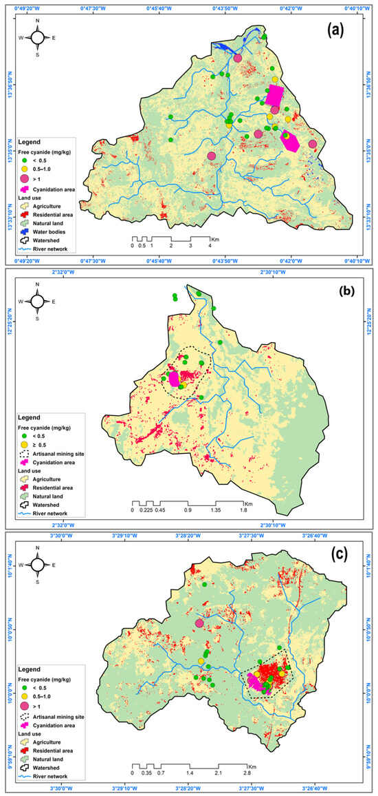 Spatial analysis maps of free cyanide pollution combined with land use in the sites of (a) Zougnazagmiline, (b) Guido, and (c) Galgouli.