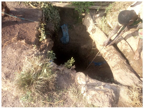 Gaseous hydrogen cyanide released during cyanidation can be dispersed by the wind toward nearby communities []. However, rainfall runoff remains the principal cyanide transport mechanism. It carries cyanide-rich residue from cyanidation ponds to surface water bodies—such as rivers and reservoirs—and facilitates infiltration into the groundwater []. Groundwater is particularly vulnerable, often subjected to dual contamination via infiltration and runoff due to the absence of protective wellheads (Figure 9).