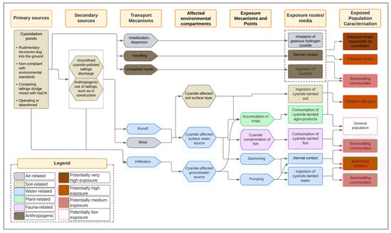 Using the online software Lucidchart (Lucid Software Inc., South Jordan, UT, USA), cyanide transport flows were mapped from leaching ponds and mine tailings storage areas to human and environmental receptors. Transport mechanisms, such as runoff and infiltration into groundwater, were integrated to illustrate the main dispersion pathways. The developed model identified key exposure routes—including inhalation of hydrogen cyanide gas (HCN), ingestion of contaminated water, and dermal contact with polluted soils and waters—as well as critical receptors, such as mine workers, nearby residents, and vulnerable aquatic ecosystems. This process led to the creation of an initial site conceptual model, which was then submitted for validation.