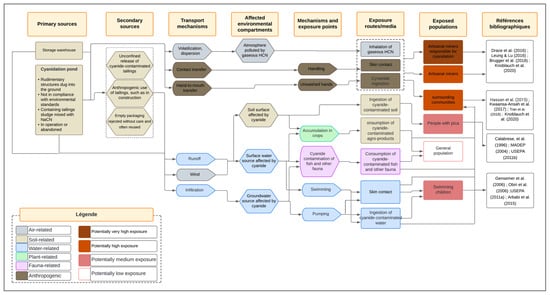 Additionally, freshwater fish—highly sensitive to cyanide—can accumulate the contaminant in their tissue when exposed to polluted waters. Although cyanide concentrations in fish decline after removal from contaminated environments due to its conversion to less toxic thiocyanate [], consuming such fish during the contamination period can cause adverse effects in humans, ranging from mild symptoms to severe reactions depending on the ingested dose and individual susceptibility []. Figure 10 provides an overview of the initial version of the site conceptual model developed to assess cyanide-related exposure risks in ASGM contexts in Burkina Faso.