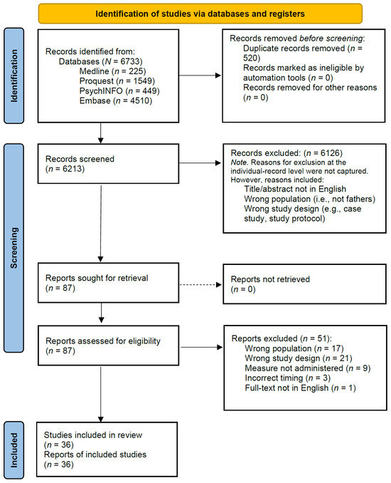 The search initially produced 6733 articles from the four chosen databases (Figure 1). Two reviewers independently reviewed all texts to determine eligibility. Overall ratings of agreement between the two independent reviewers were high, with initial consensus (i.e., include’ or ‘exclude’ for full-text screening exceeding 90% of all texts). Following de-duplication, 6213 articles were identified to undergo title and abstract screening, yielding 87 articles that met the inclusion criteria for full-text screening. Records excluded at the title and abstract phase included those that fell clearly outside of the study inclusion criteria. Fifty-one studies did not meet the inclusion criteria following full-text screening and were rejected for reasons described in Figure 1. In total, 36 unique studies met the inclusion criteria and were retained for this review (Table 1).