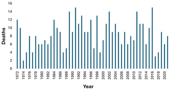 This is a retrospective case series of recorded scuba diving deaths in Australia from 1 January 1972 to 31 December 2021, inclusive. Ethics approval for the collection and reporting of these data was received from the Victorian Justice Human Research Ethics Committee to access the National Coronial Information System (NCIS) (approval number CF/21/18434). A search was made of the NCIS [7] for scuba-related deaths from 1 July 2000 (from when cases are listed) to 31 December 2021 and these were matched with data obtained from other sources, including additional coronial documents and police and media reports. Earlier data were obtained from the Australasian Diving Safety Foundation fatality database (ADSF) [8] and Project Stickybeak Reports [9,10].