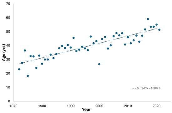 Average age of scuba fatality casualties from 1972 to 2021.