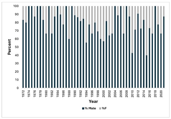 Relative proportions of male and female fatalities annually.