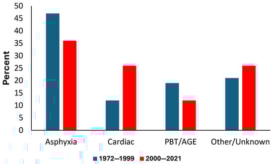 A comparison of the DCs for the two periods is shown in Figure 5. Note the reduction in asphyxia (i.e., primary drowning) and increase in cardiac-related DCs. There was also a reduction in cases of lung over-expansion injuries (pulmonary barotrauma) and associated arterial gas embolisms (PBT/AGEs).