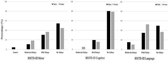 Regarding delay prevalence, although less prevalence of delays was observed for children in public ECCs in the motor and language categorizations of performance, no significant differences were found (p > 0.050). Approximately 50% of the children showed motor delays, 20% cognitive delays, and 55% language delays. Figure 1 presents the prevalence of delays (severe, moderate, and mild) and typical development [20].