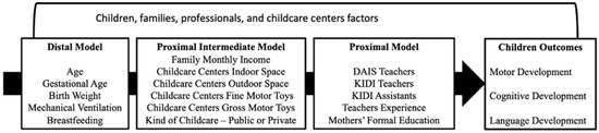 Several procedures were conducted to test the assumptions for the hierarchical regression analysis. The results showed that the normality of residuals was confirmed by the Kolmogorov–Smirnov (p-values > 0.05) test for all models; the Q–Q plot also visually confirmed the normality. The Breusch–Pagan test (p-values > 0.050) and a scatterplot of residuals indicated the homoscedasticity of the models. The Durbin–Watson statistics indicated the independence of error distribution (values between 1.5 and 2.1). The VIF test indicated collinearity (values from 6.1 to 21.5) for several variables (birth height, birth weight, mode of delivery, mechanical ventilation, APGAR 50 min, days in the neonatal intensive care unit, teachers’ experience, and assistants’ experience). When age, birth height, APGAR 50 min, days in the neonatal intensive care unit, and assistants’ experience variables were included, all the models reached non-collinearity. The hierarchical theoretical model was created using the assumptions established by Victora et al. (2015) [30], organizing all factors according to the proximity to the presented outcomes measured. We used a cumulative hierarchical regression approach, where variables from earlier models were kept in all subsequent steps to evaluate the added contribution of each new set of predictors [28]. The selection of the allocation levels of variables for the hierarchical model followed the logic of individual factors, factors in the context of child development, and factors of daily care of the child, enrolling individuals and experiences within this daily routine.