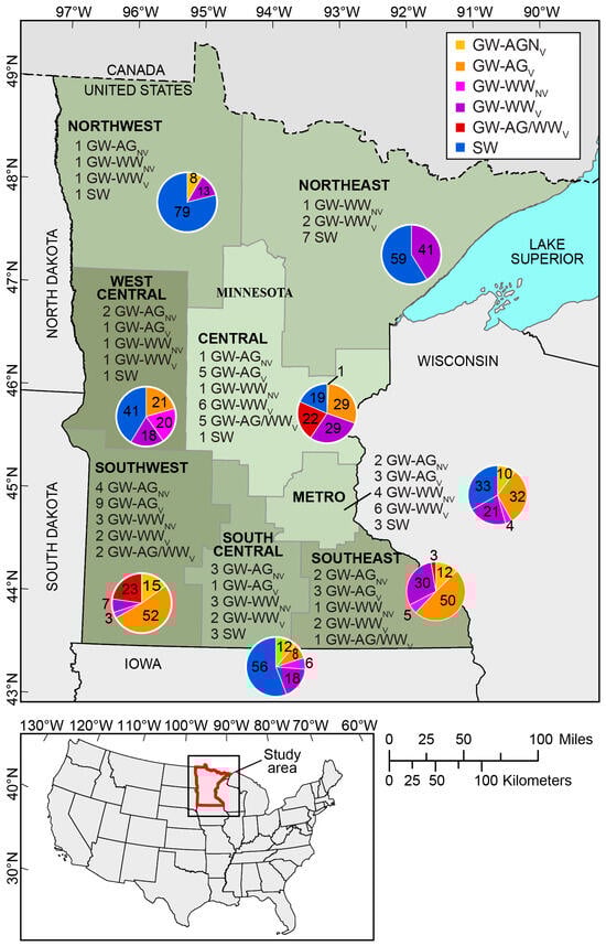 Map showing general locations of Minnesota community water supply systems from which paired source and finished water samples were collected, 2019–2022. Pie charts show the percentage of unique contaminants detected in each sampling network located within each region. Community water supply systems were categorized by facility type: surface water sourced (SW), groundwater sourced likely to be influenced by agricultural activities on the landscape (GW-AG), groundwater sourced likely to be influenced by wastewater inputs to the environment (GW-WW), and groundwater sourced likely to be influenced by both agricultural activities and wastewater inputs to the environment (GW-AG/WW). The number of water supply systems sampled is provided in front of the facility type designation. Subscripts ‘V’ and ‘NV’ indicate if the groundwater well was considered vulnerable or non-vulnerable to pollution, respectively. Basemap from U.S. Geological Survey 1:24,000 2023 National Boundary Dataset; Universal Transverse Mercator; zone 15 North; North American Datum of 1983.