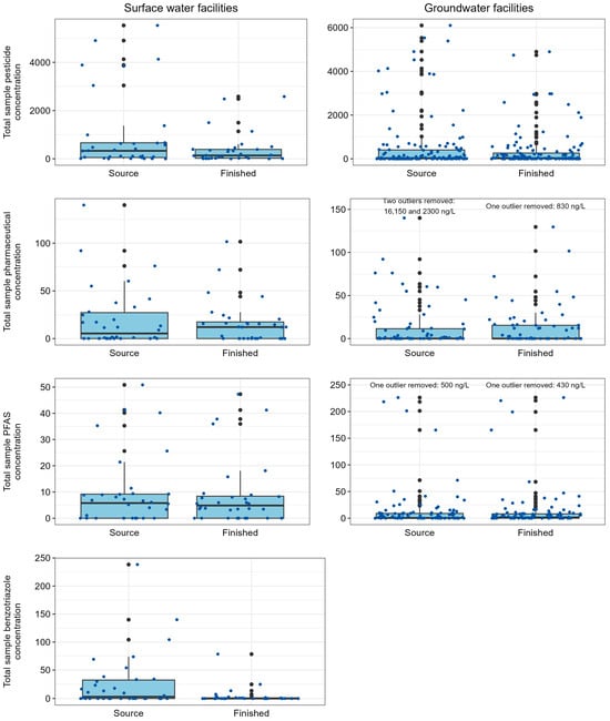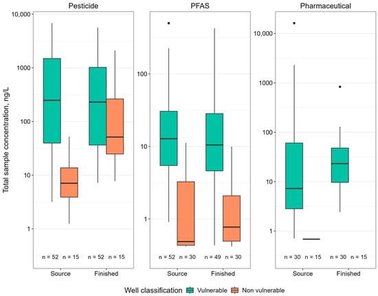 Boxplot summary of total sample concentrations of pesticides, per- and polyfluoroalkyl substances (PFAS), and pharmaceuticals detected in source and finished water samples collected from groundwater-sourced drinking water facilities classified as vulnerable and non-vulnerable. No pharmaceuticals were detected in finished water samples collected from non-vulnerable wells. The 25th, 50th, and 75th percentiles are represented by the bottom of the box, black line within the box, and top of the box, respectively. Whiskers extend to the minimum and maximum values and outliers are represented by individual dots. Number of samples are indicated on the bottom of each boxplot.