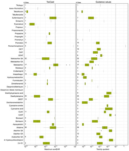 Boxplot summaries of health-risk screening for pesticide concentrations detected in finished drinking water samples collected in Minnesota, 2019–2022. The summation of maximum exposure-activity ratios (∑EAR) was determined by dividing environmental concentrations by activity concentrations from the U.S. Environmental Protection Agency’s ToxCast database. Toxicity quotients (TQ) were calculated by dividing environmental concentrations by guidance values from the Minnesota Department of Health (Table S2). The number of sites at which the contaminant was detected is displayed on the left edge of the graphs. The 25th, 50th, and 75th percentiles are represented by the bottom of the box, black line within the box, and top of the box, respectively. Whiskers extend to the minimum and maximum values and outliers are represented by individual dots. Only pesticides with at least one EAR > 0.001 or TQ > 0.1 are shown.