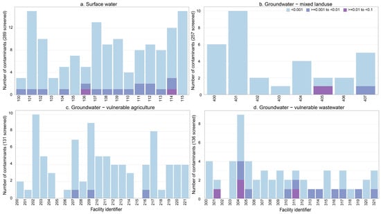 Stacked bar charts showing the number of contaminants with exposure-activity ratios (EAR) that fall within specified ranges (see legend) in finished water samples collected from (a) surface water sourced drinking facilities, (b) groundwater sourced drinking facilities located in areas of mixed agriculture and wastewater land use, (c) groundwater sourced drinking facilities located in agricultural and vulnerable areas, and (d) groundwater sourced drinking facilities located in areas with substantial wastewater sources and in vulnerable areas located within Minnesota, USA.