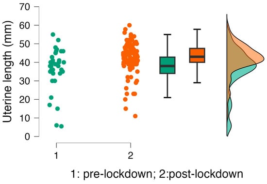 | Uterine length, cm | 36.16 ± 11.70 | 42.33 ± 8.16 | U = 1135 | rrb = 0.381 | <0.001 * |