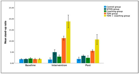 When making the comparison between the TDN and combination TDN-coaching groups, the TDN group shows a significant higher stand-up ratio during the intervention (, p < 0.001, d = 4.4) and during post-measurement (, p < 0.001, d = 3.91).