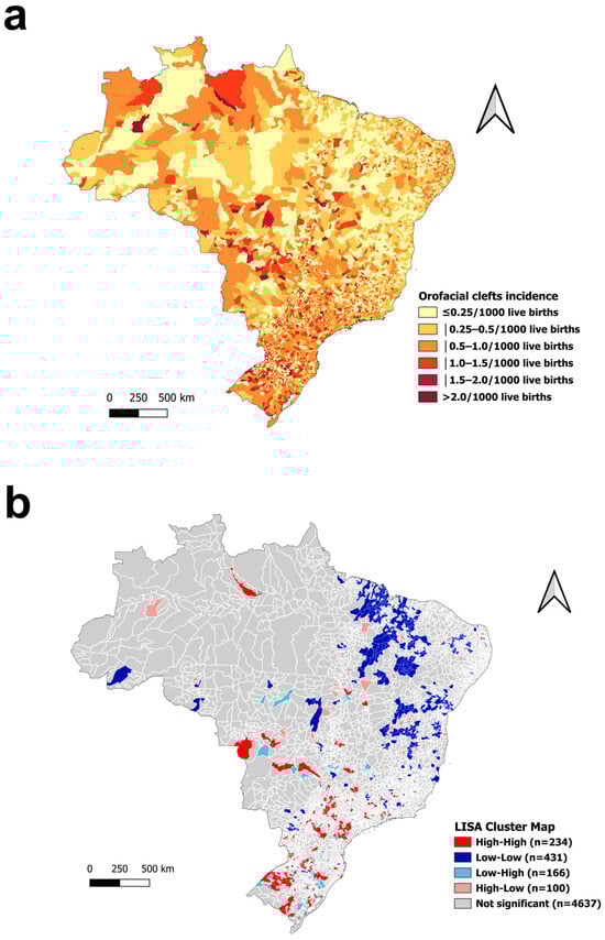Spatial distribution of orofacial cleft incidence in Brazil: incidence rates per 1000 live births by municipality (a) and Local Indicators of Spatial Association (LISA) cluster map (b).
