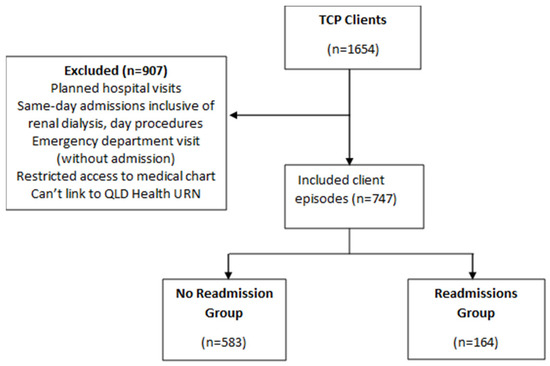Out of 1654 TCP episodes, 747 client episodes were linked to Queensland health with Unique Record Numbers (URN). From these, 583 (78%) were not readmitted to hospital during the observation period, while 164 (22%) were readmitted to hospital (Figure 1).