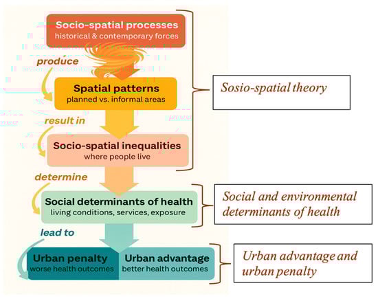 The analytical framework of this study is based on the integration of three key theoretical and conceptual lenses, namely socio-spatial theory, social and environmental determinants of health (SDOH), and the urban health advantage/penalty debate. Together, these approaches provide a critical understanding of how systemic urban inequalities, spatial dynamics, and socio-economic factors interact to influence health outcomes in Douala’s marginalized neighborhoods. They provide a framework to understand why health crises are not randomly distributed across the city but are structurally produced and spatially concentrated (Figure 1).