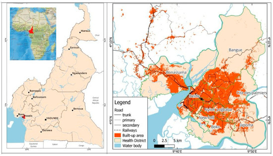 Douala, the economic capital of Cameroon, exemplifies the complex nature of urbanization in Africa. On the one hand, it is a hub of economic activity and opportunity, drawing individuals from across the country and the central African sub-region who are seeking improved living conditions. On the other hand, the rapid and largely unplanned urban expansion of the city has resulted in severe socio-spatial inequalities, with informal and disadvantaged neighborhoods bearing the brunt of inadequate infrastructure and limited access to healthcare [12]. These neighborhoods are marked by overcrowded living conditions, poor sanitation and a lack of other basic services, which together create a fertile ground for the proliferation of health crises [1,6]. The health inequities observed in Douala are not merely a byproduct of urban growth but are also deeply rooted in historical, socio-political, and economic factors. As has been found in several African cities, colonial legacies have strongly influenced the spatial layout of the city and have contributed towards patterns of segregation that still persist [13,14]. Post-colonial policies have often failed to address these disparities, further entrenching socio-spatial inequalities and limiting access to essential services for the most vulnerable populations. As a result, informal settlements have become epicenters of health crises, ranging from “everyday” risks such as infectious and parasitic diseases to larger-scale crises [5].