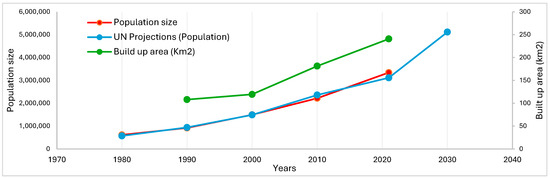 Over the past 30 years, the urban footprint of Douala has more than doubled from 108 km2 to 240 km2 [21]. If the current trends in population growth and urban expansion persist, an additional 324 km2 will be required to accommodate 1.3 million new residents by 2030 (Figure 3).