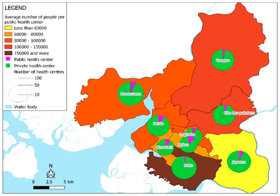 In contrast, well-planned districts like Akwa and Bonanjo are better served, with fewer people per public health center. In these wealthy neighborhoods, private hospitals and clinics offer more specialized healthcare services. The pie charts in Figure 5 show the dominance of private healthcare facilities in all districts, which significantly outnumber public facilities.