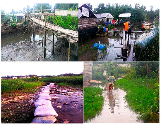 The spatial expansion of built-up areas in Douala has far exceeded the initial sites, which were relatively safe, encroaching on floodplains and areas influenced by tidal movements. This occupation has been unplanned and uncontrolled, which has increased vulnerability to flooding by creating more at-risk sites (Figure 8). This vulnerability is exacerbated by the fact that 80% of homes are built with inadequate construction materials (Figure 8).
