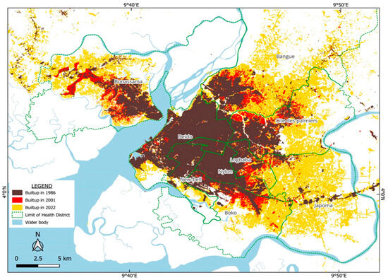 Spatial extension of the built-up area of Douala at different periods (1996, 2001, 2022).