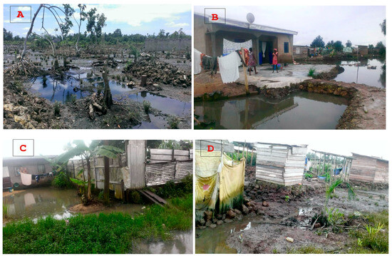 View of the precarious living environment in informal settlements. (A,B) illustrate the progress of buildings despite environmental constraints. (C,D) illustrate the poor drainage and sanitation conditions.