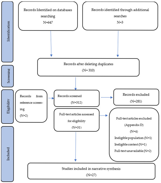 Following a double-blind process performed by two independent reviewers, the search retrieved a total of 650 records. A total of 340 of these records were duplicated studies and consequently deleted, resulting in a total of 310 records to be screened alongside 2 others found using snowballing. From these, an initial review of titles and abstracts was conducted, and 31 full-text articles were initially selected as the most relevant ones. Following thorough and comprehensive review, 4 were excluded (1 due to ineligible population, 1 due to ineligible context, and 2 due to full-text unavailability). In total, 27 were included within the narrative synthesis (please refer to Figure 1—Flow diagram of the review).