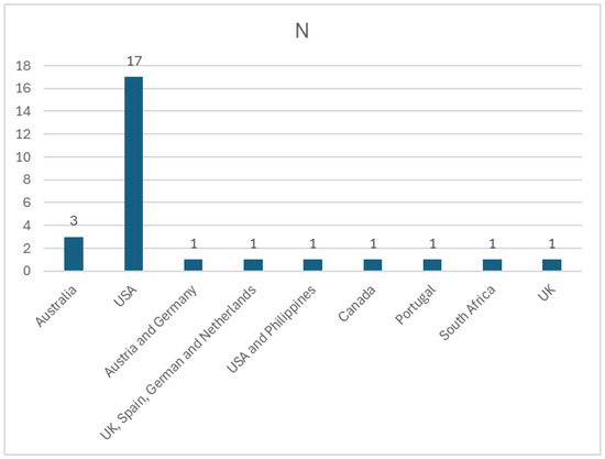 Please refer to Table A1 to locate all studies included and numbered (from 1–27). Most of the studies (eighteen) were developed in the Unites States of America (USA), two of which were conducted in partnership (one with the Philippines). These numbers demonstrate not only the American robust research infrastructure, and large economy, but also its historic emissions and concern regarding climate change impacts on public health. The American Nurses Association (ANA) is an example of an American organization representing millions of registered nurses that has made a valuable and proactive contribution on the dissemination of relevant climate change knowledge, issuing position statements and guidance for professionals [33]. Three studies have been conducted in Australia; one study was conducted in Canada and another one in South Africa. The remaining ones were carried out in Europe—one in Portugal, two in the United Kingdom (UK), one from a partnership between the UK, Spain, Germany, and The Netherlands (please refer to Figure 2).