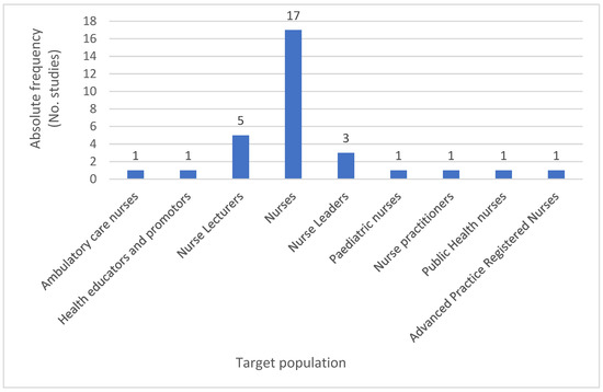 As confirmed by Figure 5 presented below, the authors identified seventeen papers (1,7,11–13,15–25,27) that refer to nurses in general, with five studies (1,4,9,10,27) directed towards nurse lecturers and nurse educators and three to nurse leaders or coordinators (1,14,23), whilst all other papers targeted a population of ambulatory care nurses (2), health educators and promotors (26), pediatric nurses (8), public health nurses (5), or other advanced practice registered nurses (6). It can be inferred that although 100% of the studies targeted nurses, a vast majority (63%) focused on general nurses as a professional group who may have a voice and a role in reducing health risks from climate change, regardless of their area of expertise.