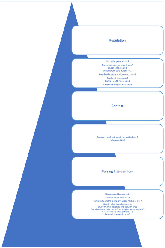 Papers eligible—as per the inclusion criteria requirements presented in a previously published scoping protocol—involved urban contexts and urban communities (such as hospital settings seen as community nursing care units), as these represent a major risk in the health of the urban population due to phenomena such as the “urban heat island” factor. Papers targeting exclusively rural contexts were excluded from this study.