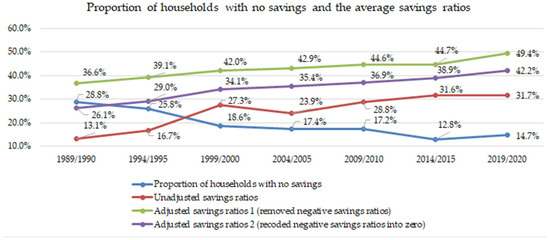 An increasing proportion of households had positive savings over the study period. Figure 1 highlights that while 28.8% of households had negative savings in the year 1989/1999, this dropped to 14.7% by the year 2019/2020. The extra-large standard deviations (about 700–3200%) of the unadjusted savings ratio across the years indicated a substantial bias if calculations included all households with negative saving amounts. Thus, two series of adjusted saving ratios were reported, both of which indicated a persistently increasing trajectory over the study period.