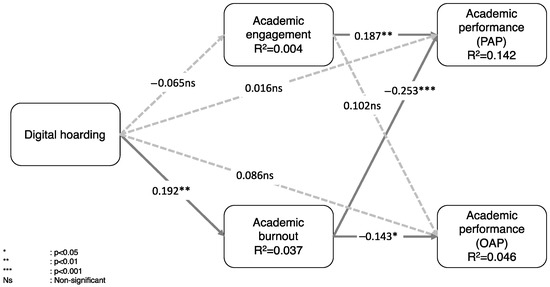 As suggested by Ref. [58], the assessment of HOC reliability and validity must be manually calculated. In reflective-reflective constructs, path coefficients correspond to loadings [59]. As the reader can see in Supplementary Table S1, the reliability and validity of digital hoarding, academic engagement, and burnout were over the threshold suggested, i.e., composite and Cronbach’s alpha over 0.7 and AVE over 0.5, thus confirming the reliability and validity of the outer model.
