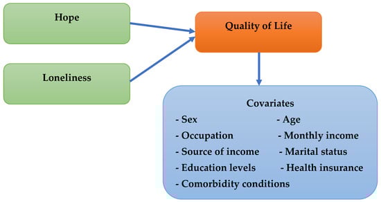 Thus, this study integrates resilience theory to investigate how hope (as a protective factor) and loneliness (as a risk factor) influence QoL, considering contextual variables like aging, health status, and social structure. Guided by this framework, we hypothesize that (H1) higher levels of hope are positively associated with better QoL among rural older adults; (H2) higher levels of loneliness are negatively associated with QoL; and (H3) socio-demographic factors such as monthly income and health status significantly influence QoL in this population (see Figure 1).