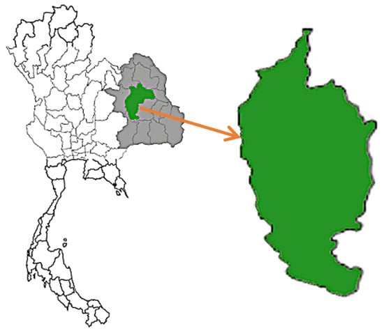 A map of the study site highlighting the Maha Sarakham Province (green), the area where primary data collection was conducted.