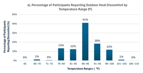 Most participants (72%) reported feeling discomfort during outdoor activities at temperatures above 86 °F, with a mean thermal discomfort threshold of 89.4 °F (95% CI: 88.8–90.0) (Figure 2). This aligns with thermal comfort literature for tropical climates [30,31]. In 2020, this threshold was exceeded on 111 days, including 73 days (60%) during the summer months of June through September (Figure 2).