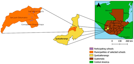 This study employed a quasi-experimental, pre-post design to assess changes in HH practices among students aged 8 to 13 years before and after an intervention. Six public primary schools were selected by convenience based on Universidad del Valle de Guatemala’s (UVG) previous presence in the department of Quetzaltenango, Guatemala due to their epidemiologic surveillance program at the local hospitals and according to selection criteria (being open with in-person classes according to the Ministry of Education’s COVID-19 epidemiological surveillance and willingness to participate in the study). Two schools were classified as urban, and four schools were classified as rural. The intervention was implemented from October 2022 to April 2023 at six primary schools in three different municipalities (San Miguel Sigüilá, San Juan Ostuncalco, and Concepción Chiquirichapa) of Quetzaltenango (Figure 1). Before and after the intervention, two types of data were collected at the schools to benchmark their HH practices using HH observations and hand dirtiness evaluations. Pre-intervention data were collected during May–June 2022, and post-intervention data were collected in July 2023.