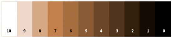 To assess students’ hand dirtiness, we used the Quantitative Personal Hygiene Assessment Tool (qPHAT) [15]. The methodology involves tracing the palm and fingertips of the participant’s hand with a pre-moistened Hygea (PDI, Orangeburg, NY, USA) sterile saline gauze pad and comparing the darkest half-square inch area of the gauze pad to the qPHAT color scale [15] (Figure 2). The qPHAT uses a scale from 0–10 where 0 indicates the most visible dirt possible and 10 indicates the absence of any visible debris or dirt. Hand swabs were collected at three different times during the day: as students entered school, after restroom use, and before eating. Students were selected by convenience as they were walking into school, going to the restroom, or at recess. After the sample was collected, the score on the qPHAT scale was determined and agreed upon by two enumerators. If the value fell between two numbers, the higher value was recorded, as per the qPHAT methodology instructions. Scores were entered into REDCap along with students’ demographic information (age, grade, and sex), and an image of the swab. Parental consent and students’ assent was obtained before taking the swabs. To detect a significant difference in hand dirtiness pre- and post-intervention with 95% confidence, we estimated that we needed to collect 21 hand swabs per school at pre-and post-intervention for a total of 126 swabs pre-intervention and 126 swabs post-intervention.