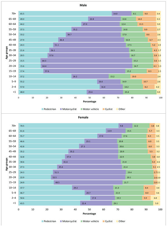 In 2021, the percentage distribution of DALY from road injuries, disaggregated by sex, age group, and road injury category, showed the highest burden from pedestrian road injuries. This burden was most prominent among children aged 0–14 years (both sexes), women aged 50 years and older, and men aged 55 years and older. For men aged 15 to 54 years, the highest percentage of DALY was due to motorcycle road injuries; in contrast, women aged 15 to 44 years had the highest DALY loss due to the same cause. Similarly, DALY attributable to cyclist road injuries were highly concentrated in children aged 10–14 years; however, these deaths represented 19.0% of the total DALY of road injuries for boys and 8.4% for girls. It is also noteworthy that cyclist road injuries accounted for more than 10% of their respective DALY in men aged 60 years and older, and this value was notably higher for the age group of 65–69 years (14.0%). Finally, women of all ages had a higher percentage of DALY due to motor vehicle road injuries than men (Figure 1).