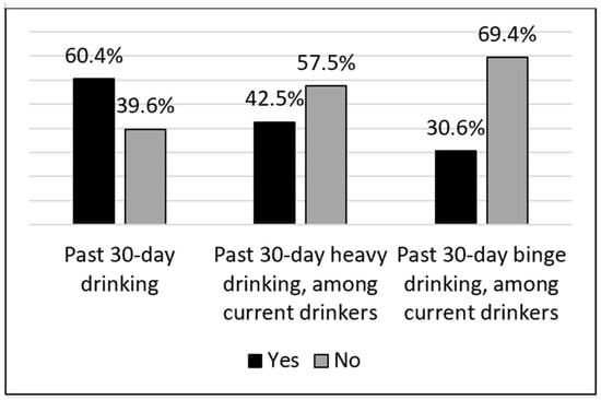 More than one-third (39.6%) of respondents indicated no alcohol consumption in the past 30 days (Figure 1). Among the majority of respondents who were current drinkers, 42.5% disclosed heavy drinking in the past 30 days and 30.6% reported binge drinking in the past 30 days.
