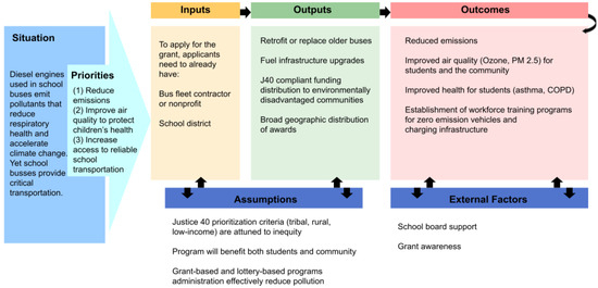Logic model summarizing the theory of change enacted by the United States Environmental Protection Agency Clean School Bus Rebate Program (CSRBP). The logic model uses the following acronyms: J40—Justice40; PM—particulate matter; COPD—chronic obstructive pulmonary disease.