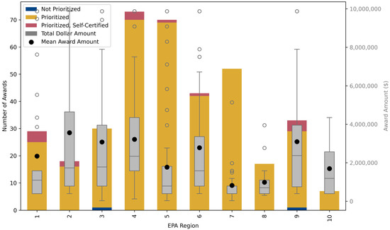 This study analyzed the geographic and socioeconomic distribution of awards made under CSBRP during its 2022 rollout, with attention to the program’s alignment with federal Justice40 Initiative criteria. Award data, including funded districts, award amounts, and EPA prioritization status, were obtained from the EPA’s publicly released program datasets [11]. EPA prioritization status, indicating whether awardees qualified under criteria such as serving low-income, rural, or tribal communities, was used as a proxy for Justice40 targeting.